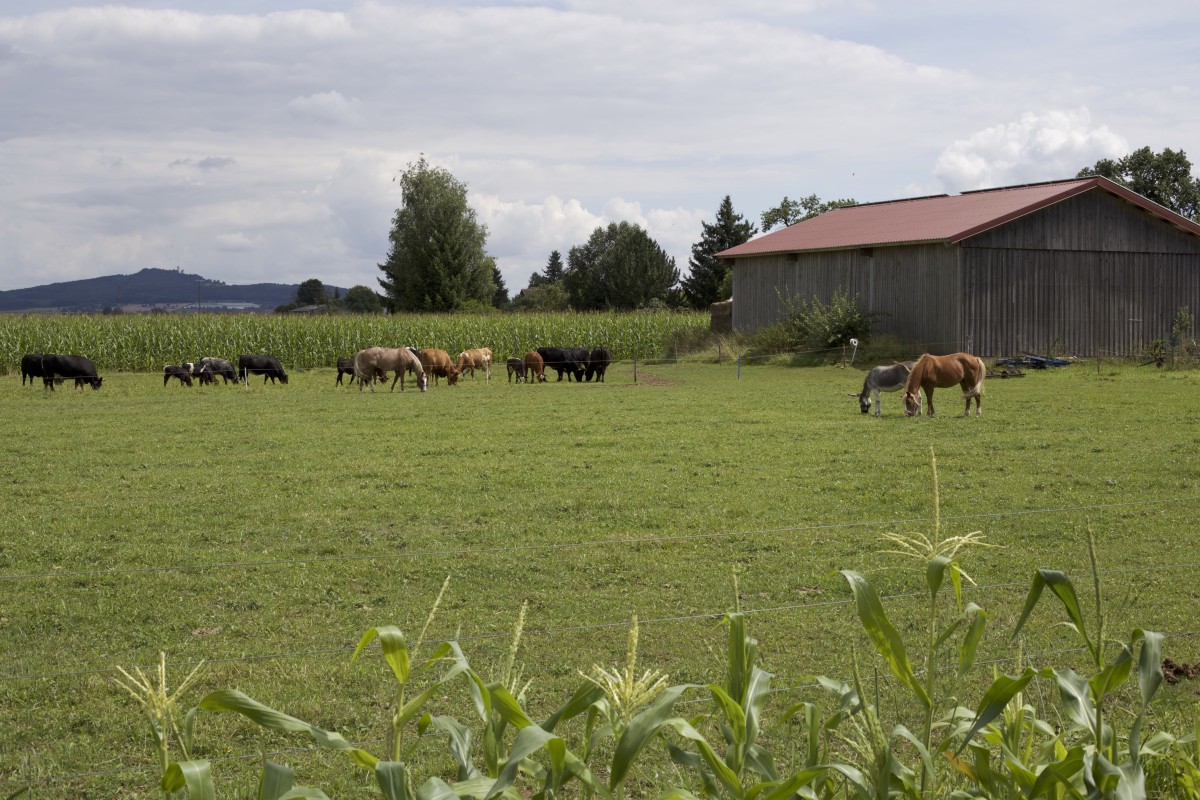Auf unseren Feldern bauen wir im Wechsel Kleegras, Hanf, Getreide, Bohnen/ Erbsen, Alblinsen/Leindotter, Mais und Kartoffeln an. Immer wieder werden Besonderheiten wie Mohn, Mischfrucht, Hartweizen usw. ausprobiert. Zwischen die Winter- und Sommerkulturen kommt zur Erholung des Bodens eine Gründüngung.